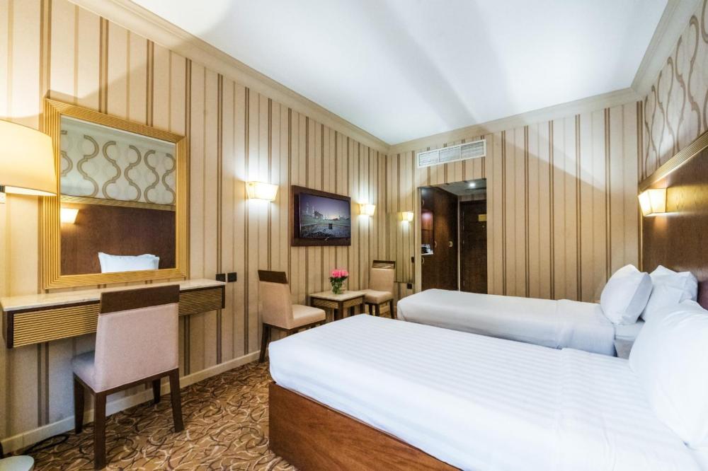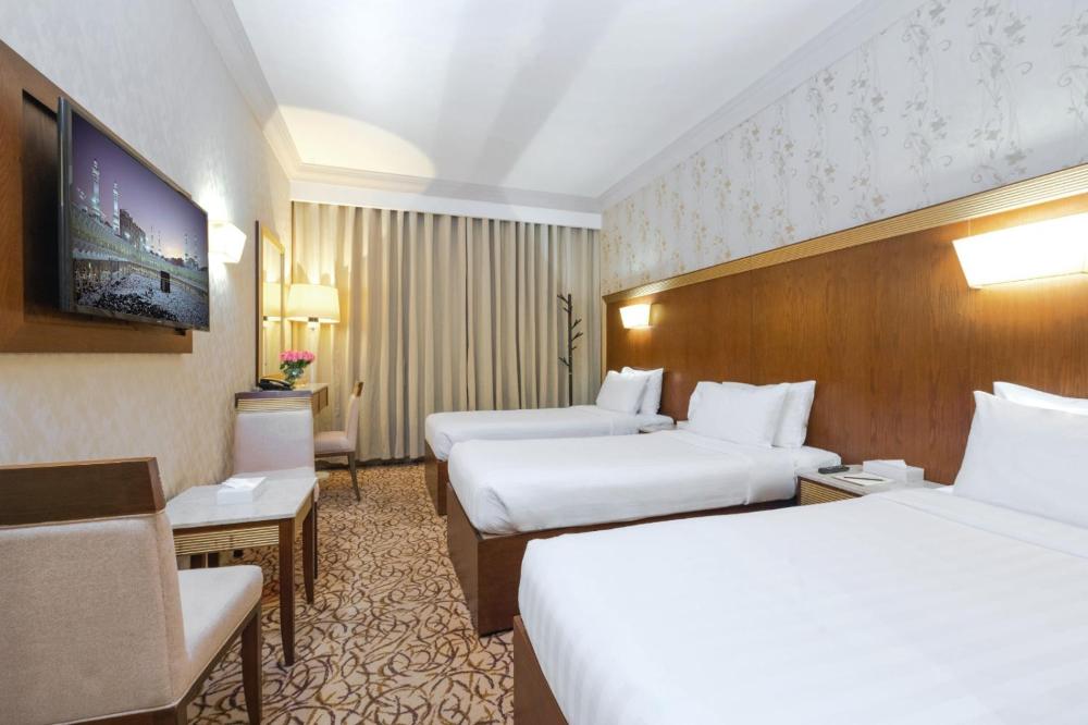 The gallery highlights the guest rooms with simple bedding and tiled flooring, the restaurant space where meals are served, and the atmosphere of Ajyad’s busy streets surrounding the property. Each image reinforces the hotel’s focus on practicality and accessibility, giving guests a clear sense of what to expect upon arrival.